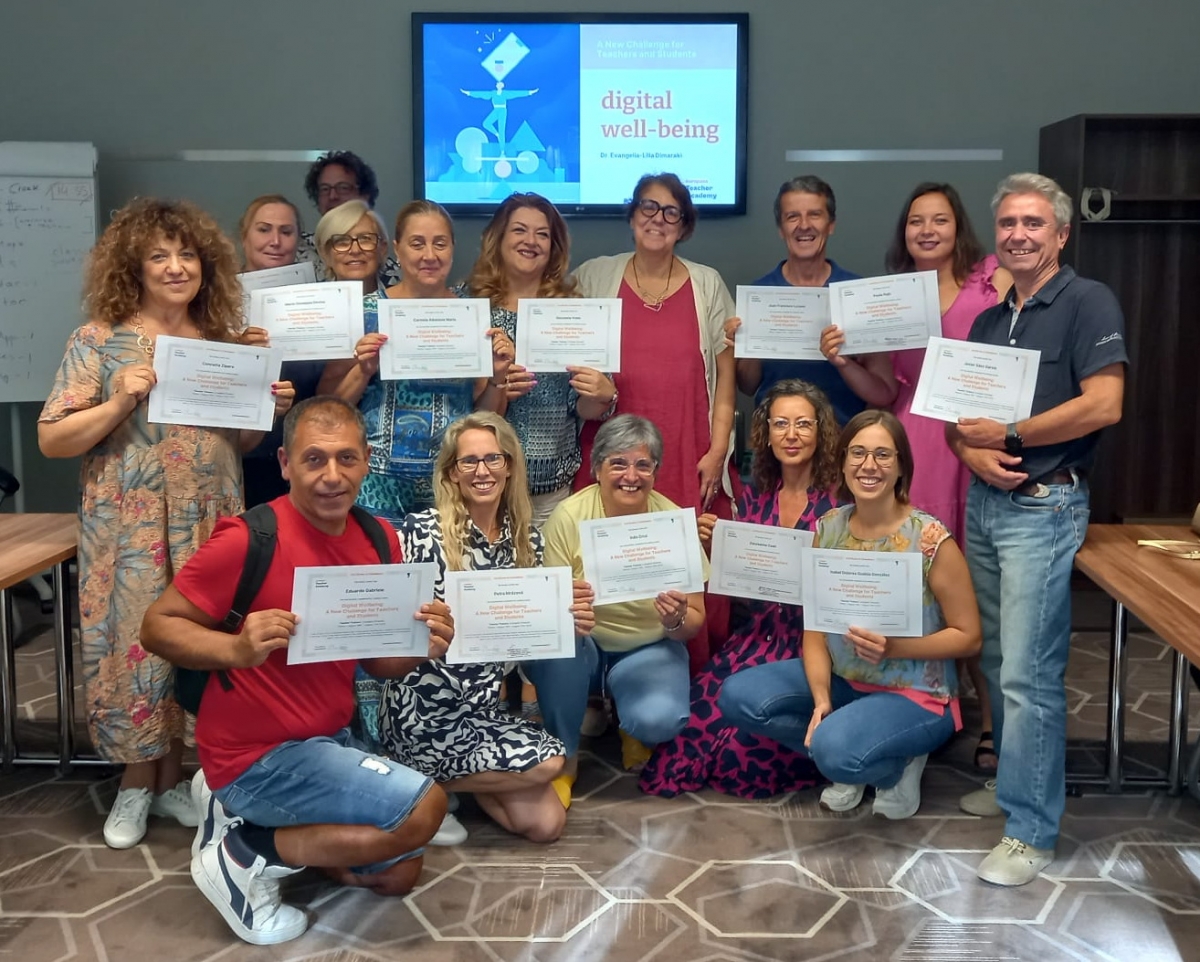 A továbbképzésen 14-en vettünk részt, nemzetközi társaságban, olasz, görög, cseh, horvát, spanyol, portugál és magyar kollégákkal együtt. A kurzus fő témái közé tartozott a telefonhasználati szokások összehasonlítása különböző országokban, a figyelemgazdaság és a technológiai cégek kapcsolata. A „Mit akarok én, és mit akar az alkalmazás?” kérdéskör körbejárása érdekes felismeréshez vezetett. Megvitattuk, hogyan lehet a technológiát pozitív módon beépíteni az oktatásba, miközben figyelembe vesszük az eszközhasználat korlátozásának szükségességét. Egy másik fontos téma a gyakori fókuszváltás veszélyeire és az identitásra, testképre gyakorolt hatásokra koncentrált. A beszélgetések során felmerült, hogy mennyire fontos az eszközmentes zónák kialakítása, különösen az iskolákban, ahol a tanár-szülő partnerség és az összefogás nélkülözhetetlen. Az egyik leghasznosabb gondolat az volt számomra, hogy a diákokkal közösen, egy „csónakban evezve” próbáljunk megoldást találni a digitális világ kihívásaira, és kerüljük a teljes tiltást, hisz ez a technológia már velünk marad